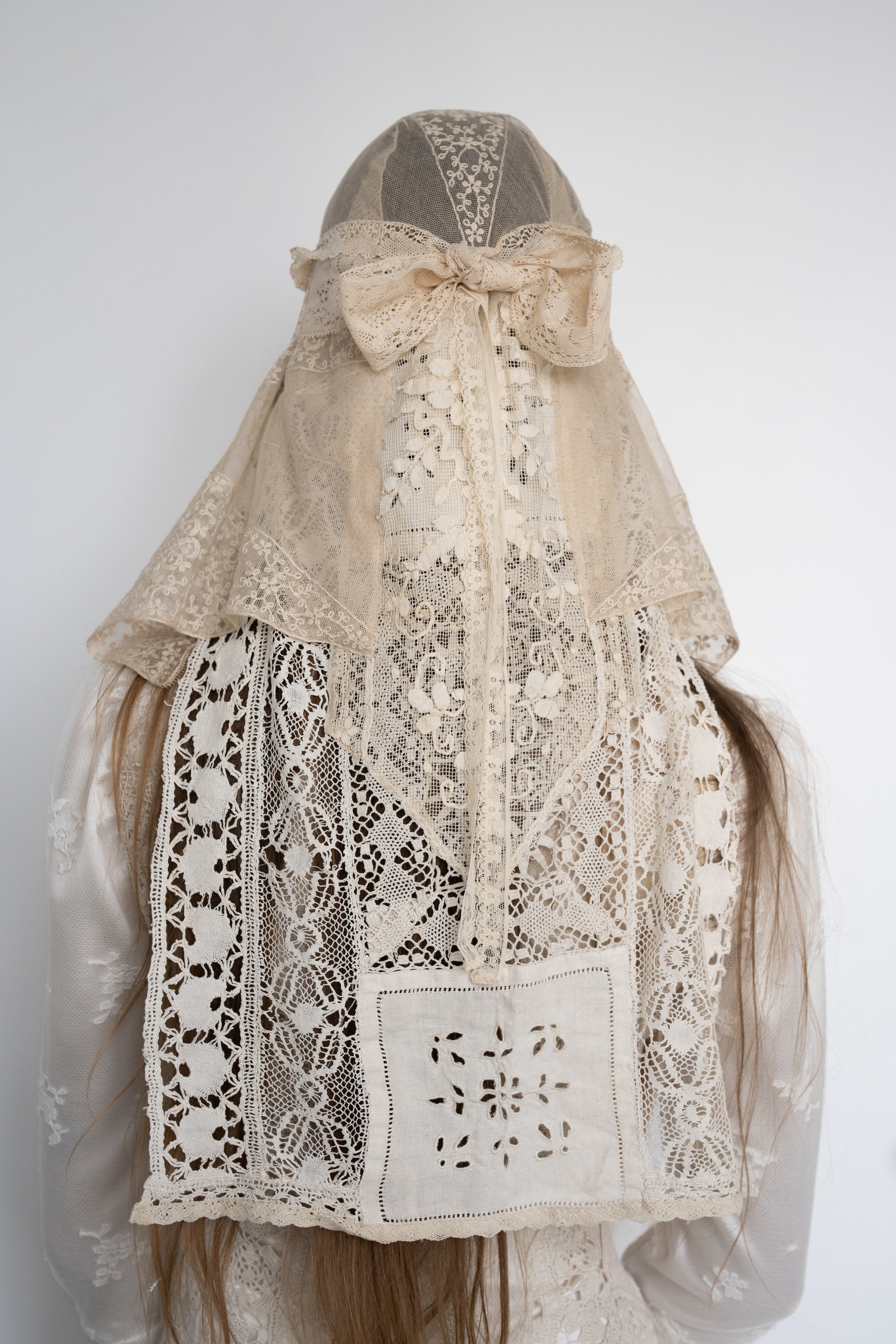 This handmade lace veil can be worn as a bridal veil, statement headpiece, or couture styling element.