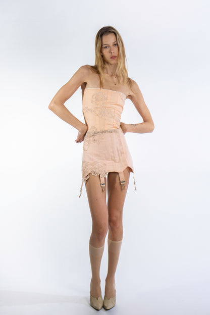 Vintage 50s underwear upcycled and restored by embroidery by hand techniques with salmon crochet.