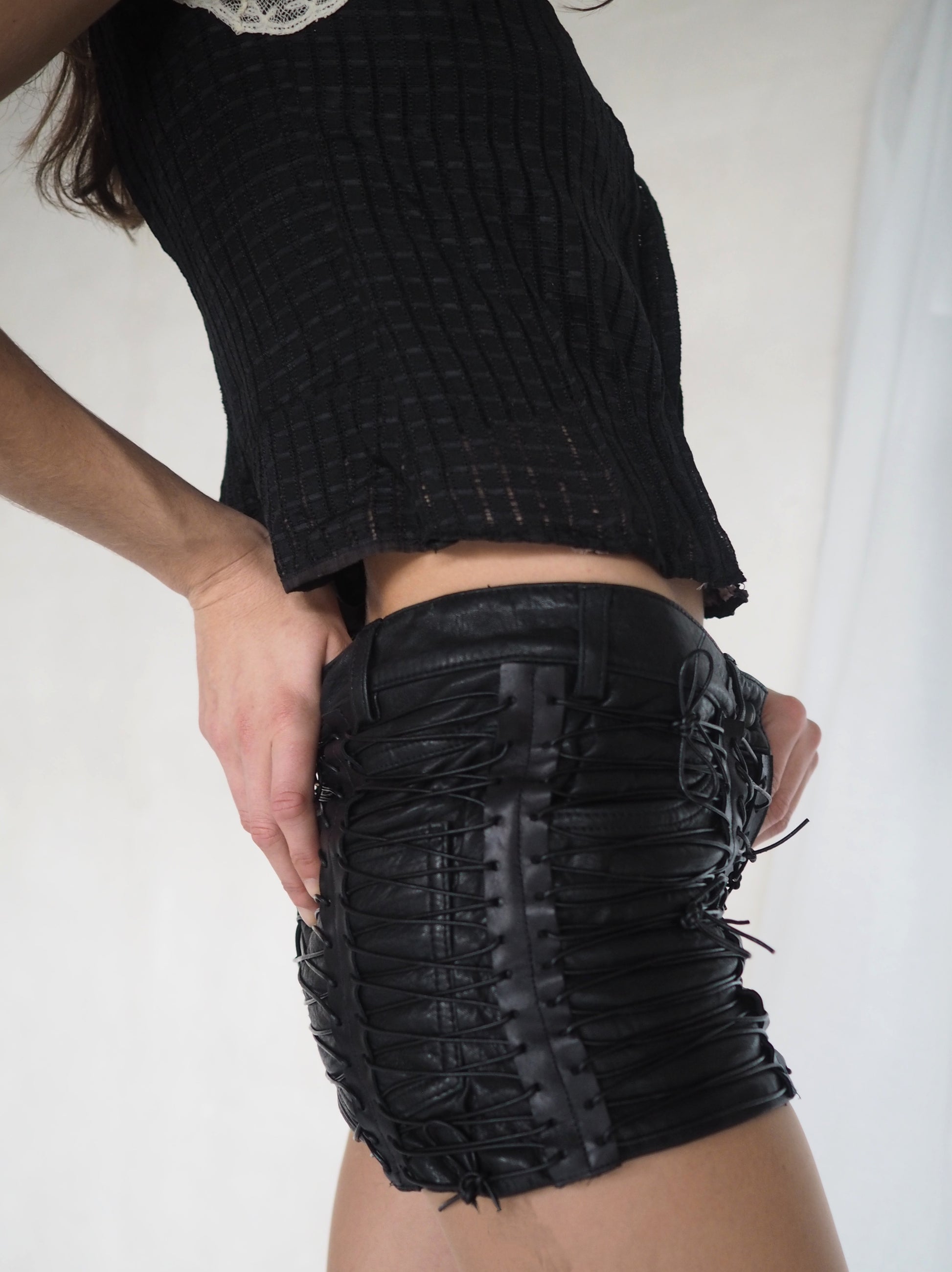 Tailored from deadstock black leather, these hand-corseted shorts are meticulously constructed with lacing details across the entire structure, revealing the precision and strength of artisanal work. The silhouette is close-fitting yet flexible, merging utility and sensuality through sculptural craftsmanship.