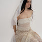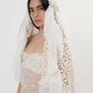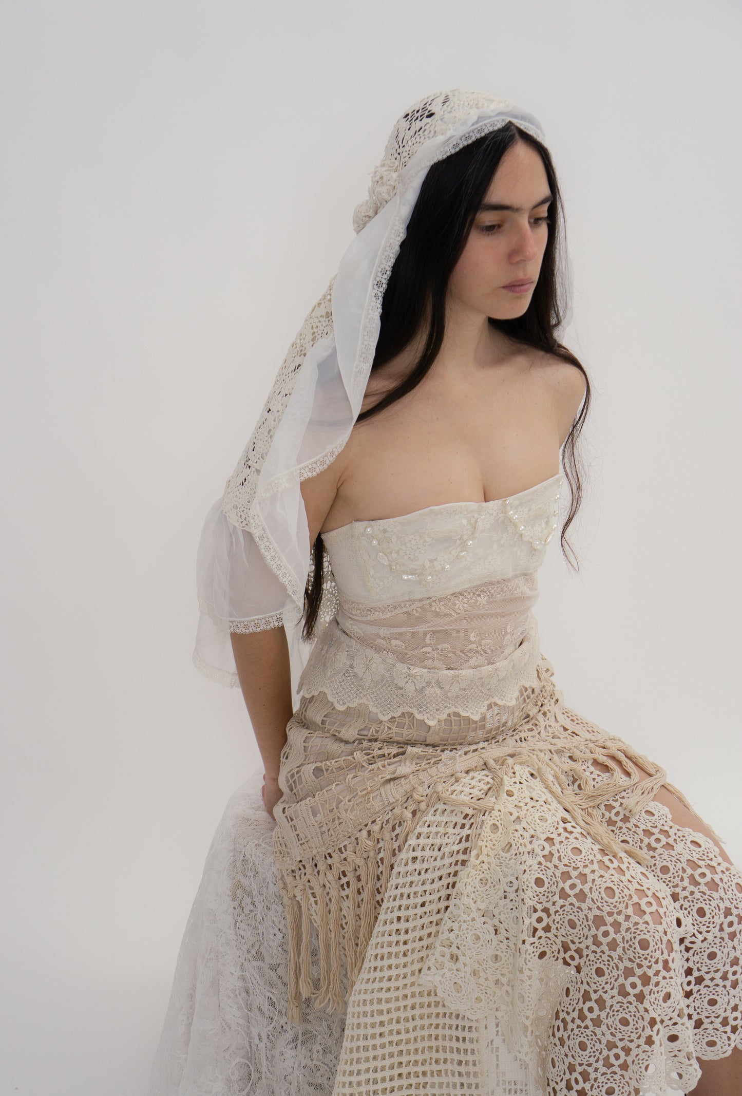 One of a kind crochet and silk headpiece with flowers and pearls detail in the back. The organza white part comes from an upcycled 19th century fabric from wedding detail.
