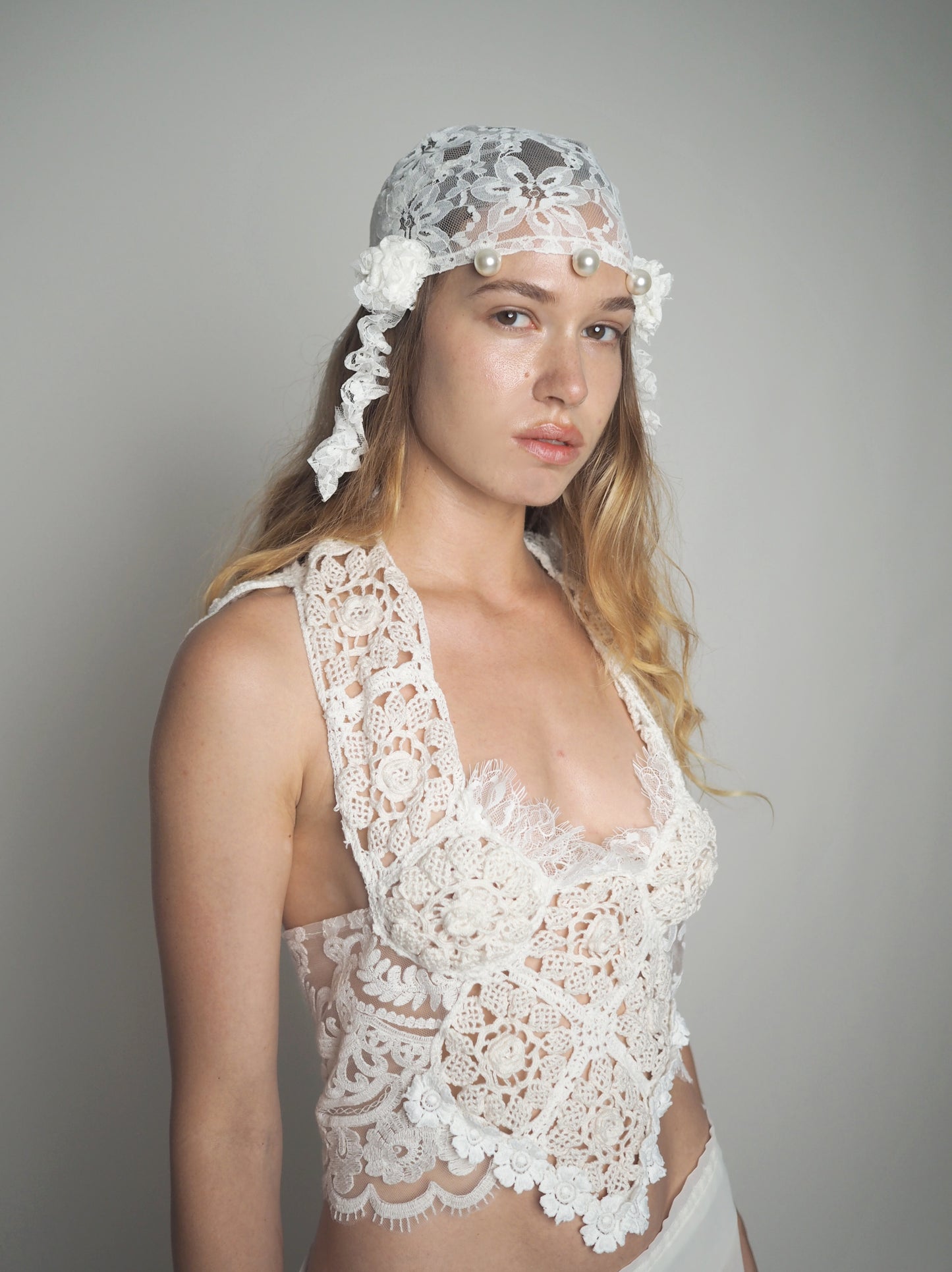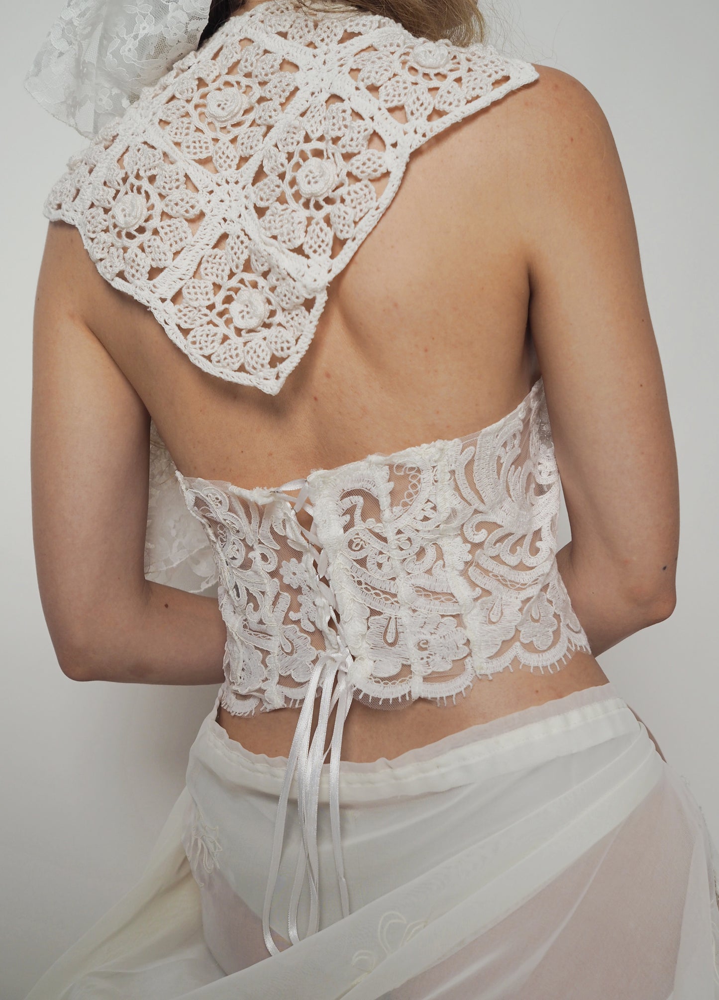 One of a kind top made with antique crochet and lace fabrics. This piece is build at our atelier in Paris using upcycling techniques.