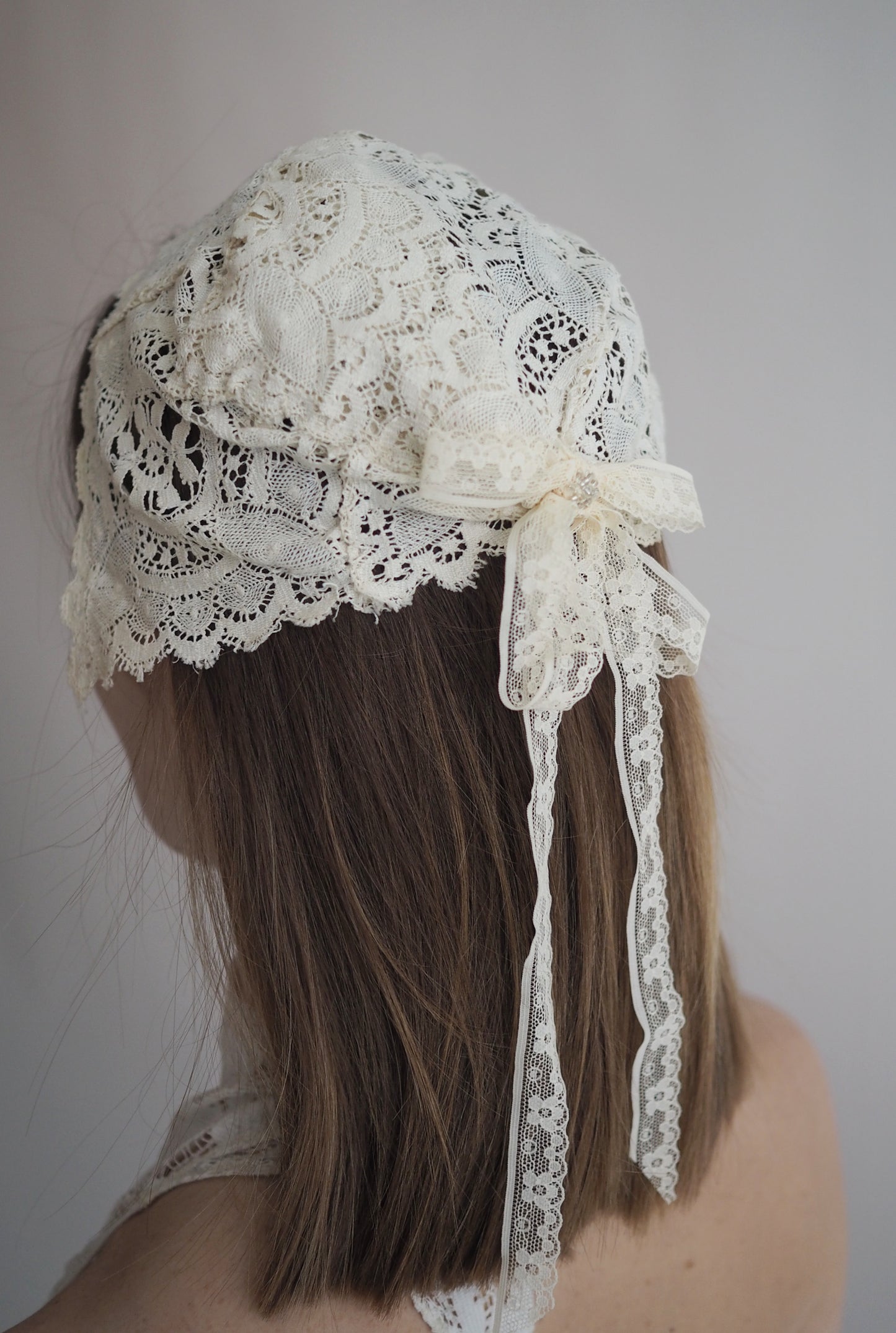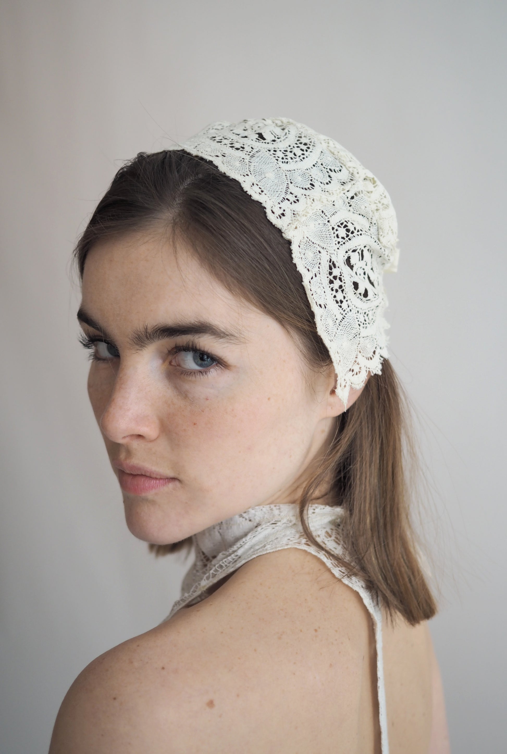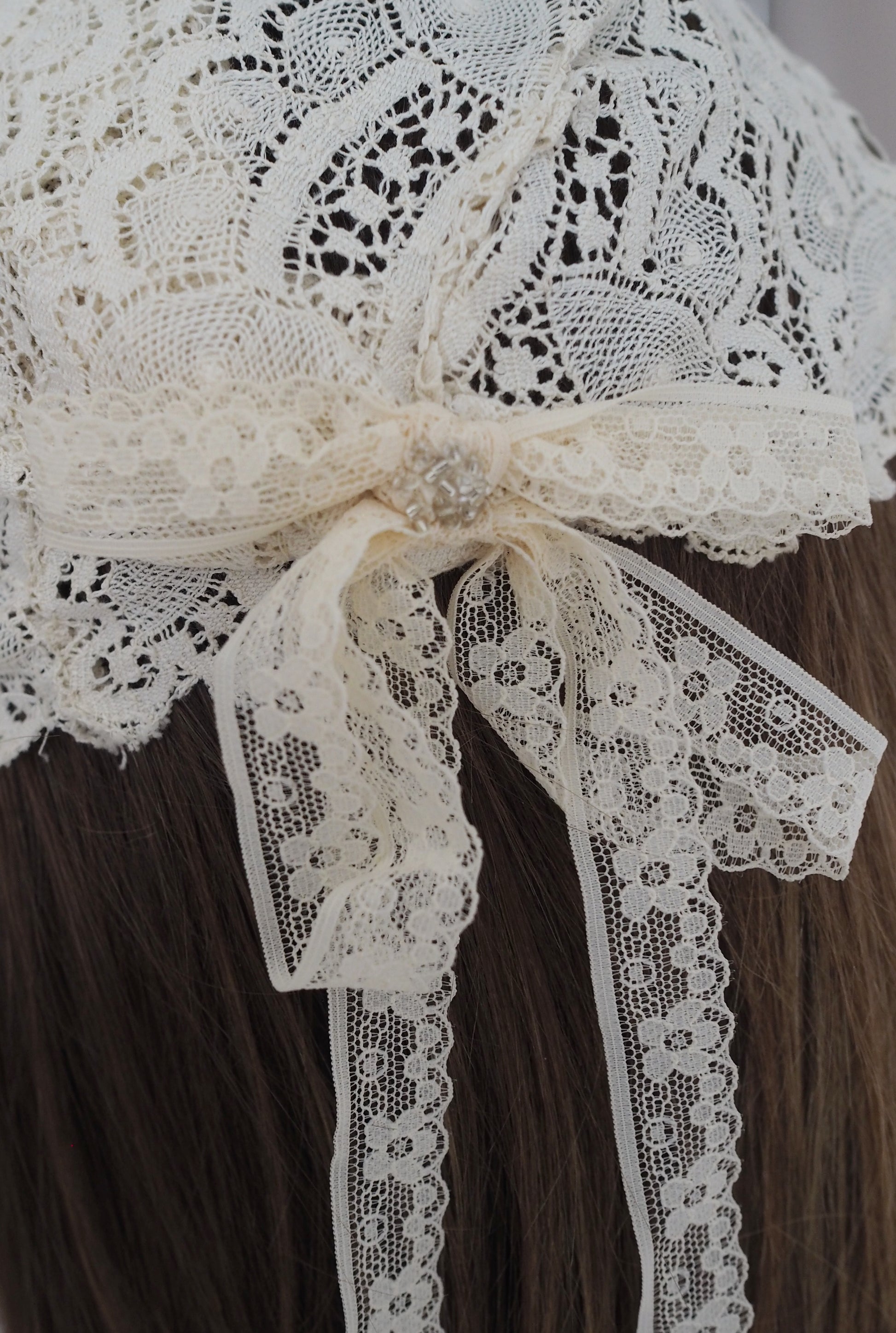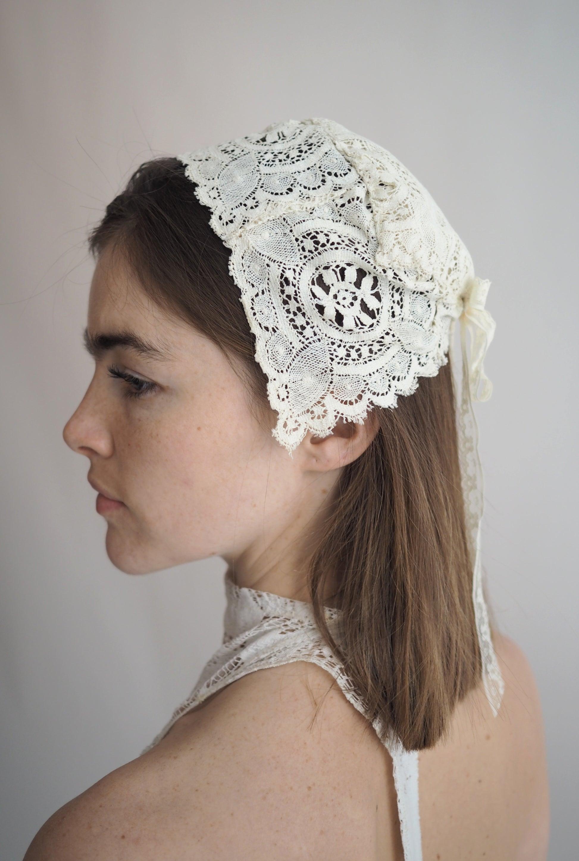 This one-of-a-kind handmade crochet headpiece is crafted from restored 19th-century crochet with fine cotton crochet. Designed to blend vintage craftsmanship with contemporary elegance.