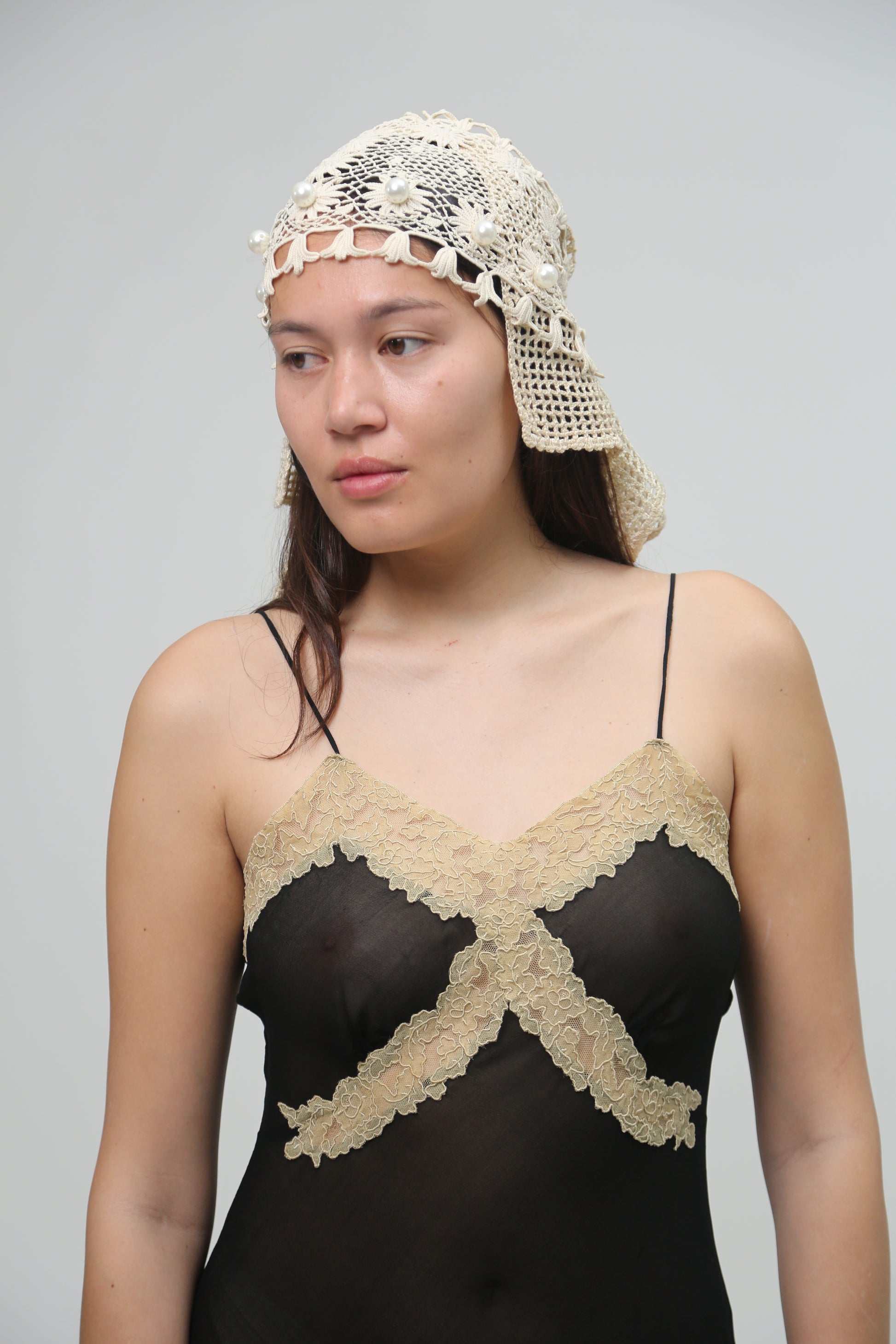 Handmade with upcycling crochet headpiece with embroidered pearls. One of a kind piece made at our atelier in Paris.