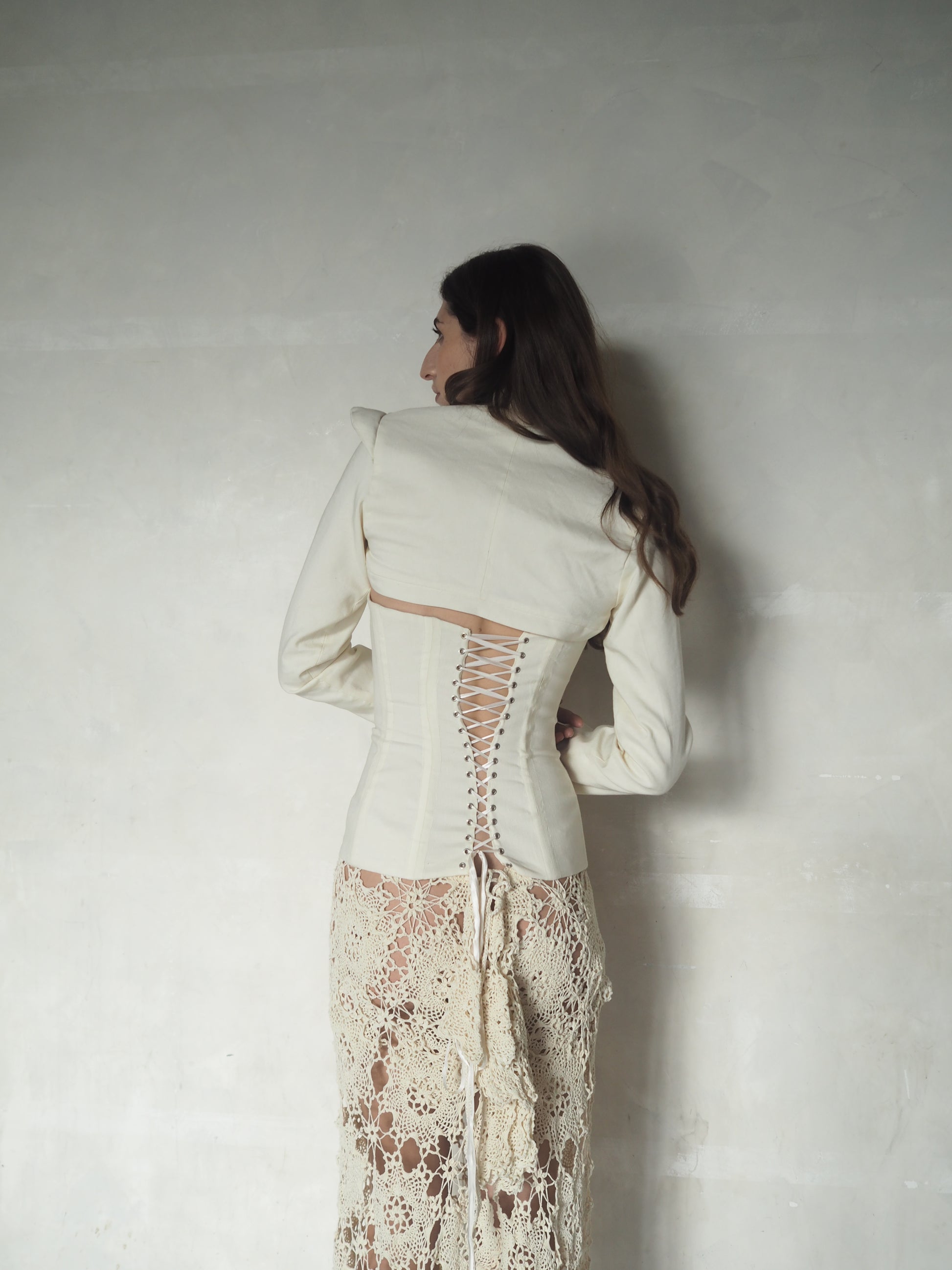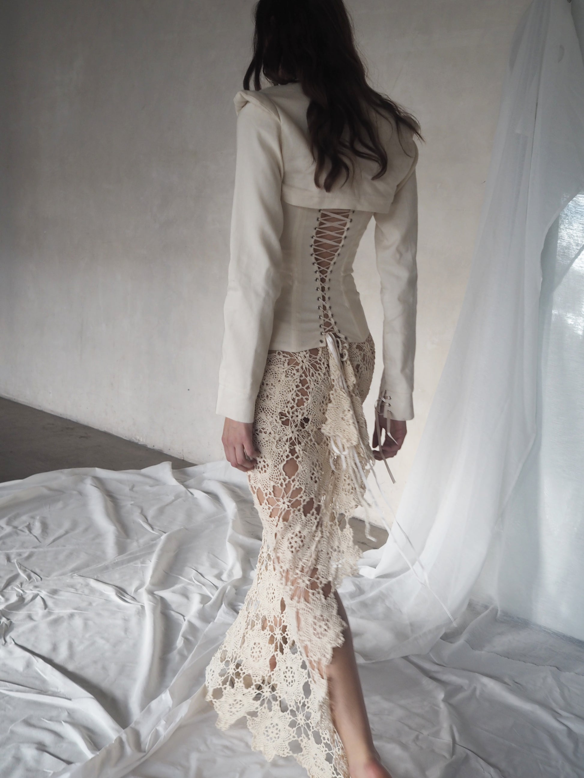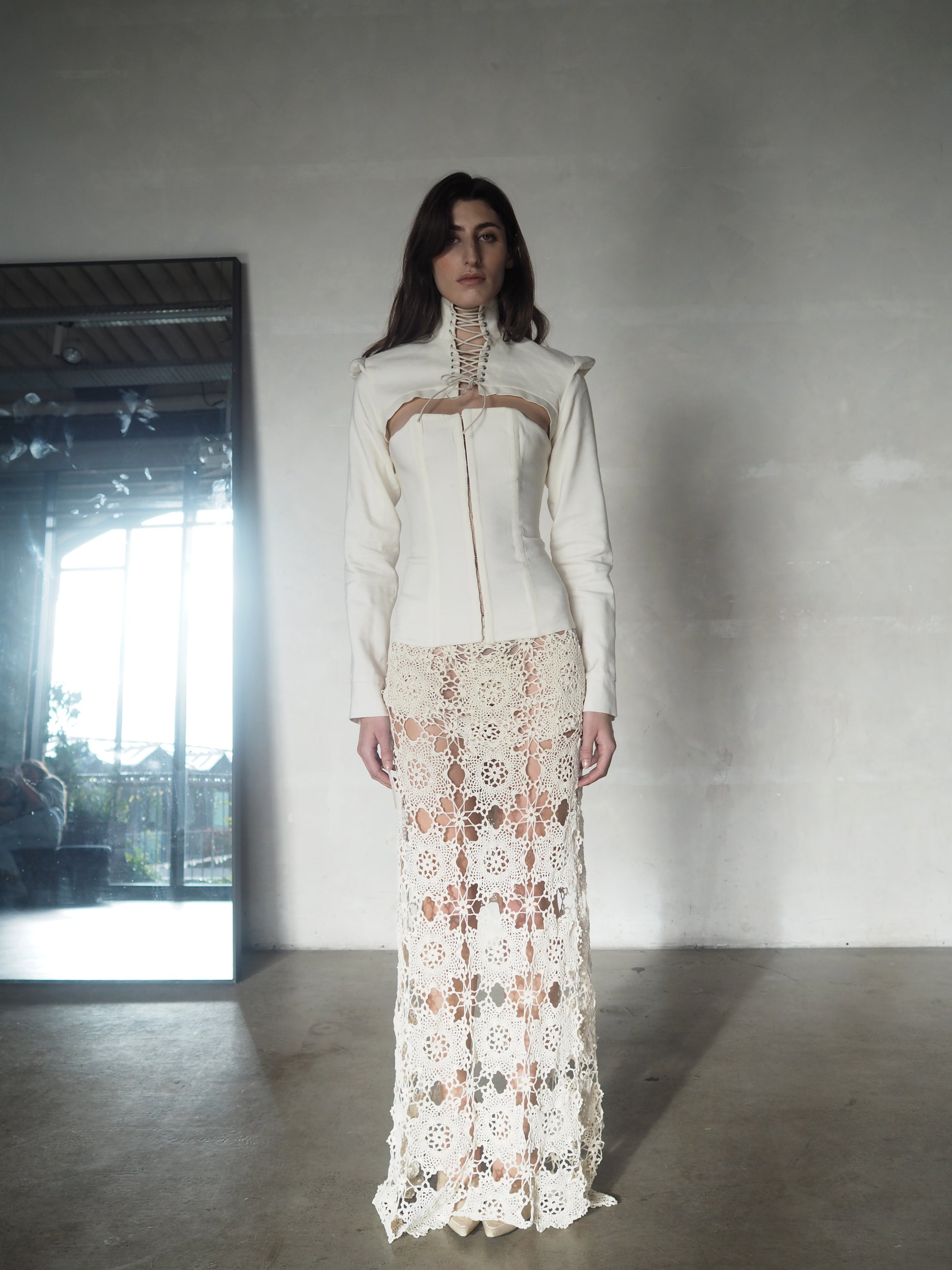 The piece sits mid to low waist with a soft, natural drape and a slightly flared finish. Light and effortless, it’s a versatile statement that can be styled alone or as a complete look with the Structured Corset Bolero.