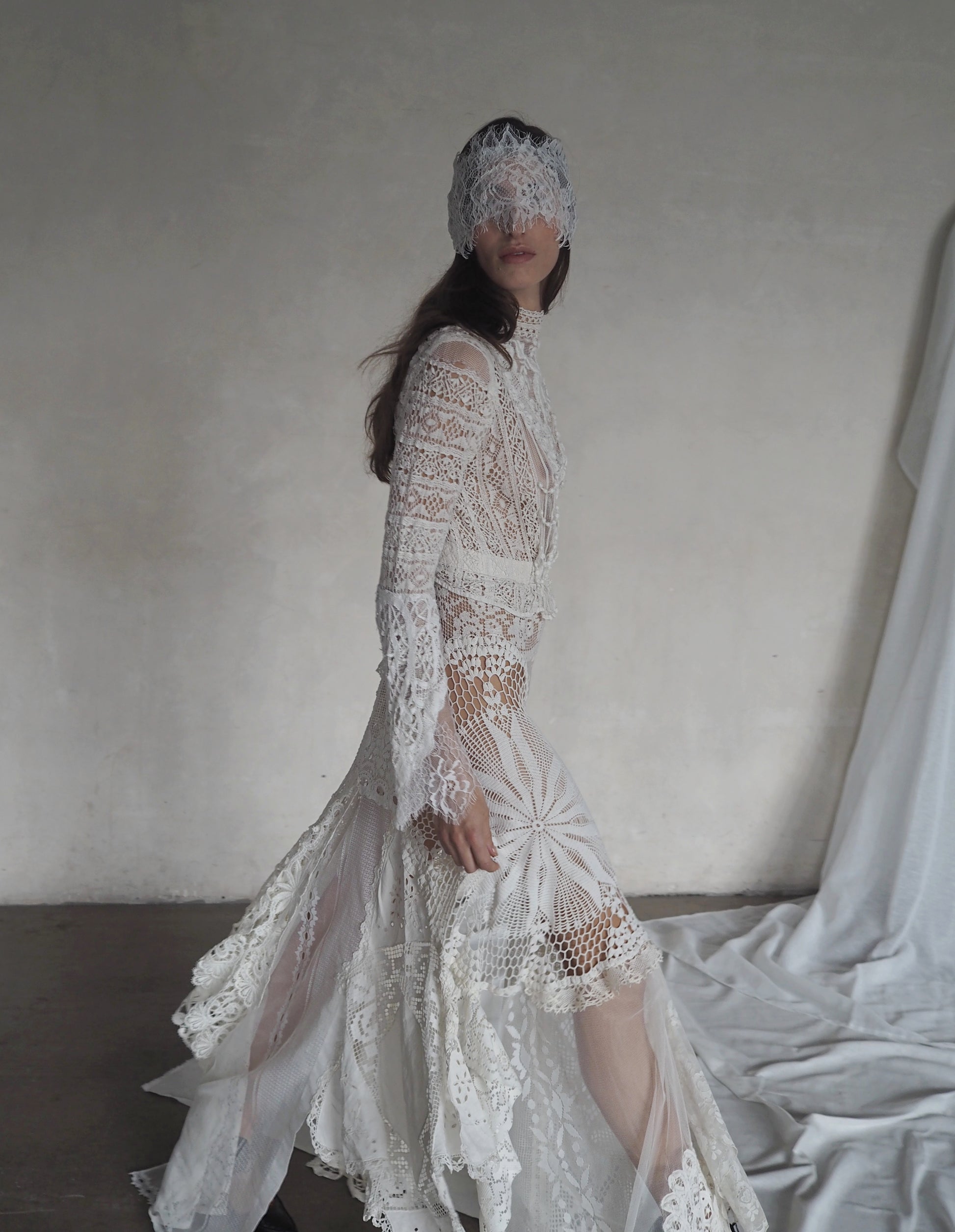 The high neckline and elongated sleeves evoke the grace of the Edwardian era, while the transparent structure and sculptural volume bring a modern sense of intimacy and power. Every lace fragment remains authentic to its century, revealing a dialogue between past and present through artisanal reconstruction.