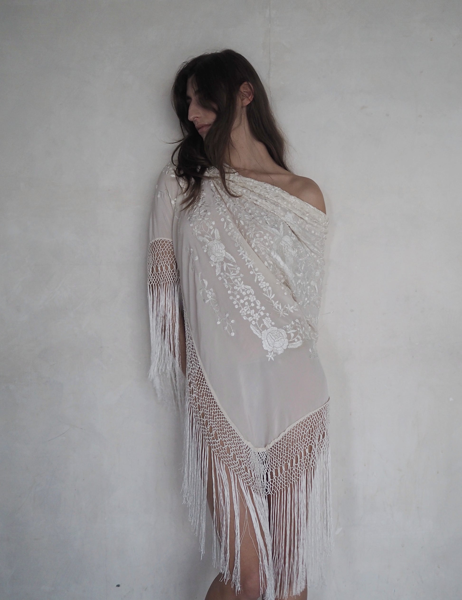 A versatile embroidered silk piece crafted from a vintage Manton de Manila, reimagined into a fluid silhouette that can be worn as a top or a short dress. The composition features hand embroidery and long silk fringes, draping softly around the body for a sculptural yet weightless effect.