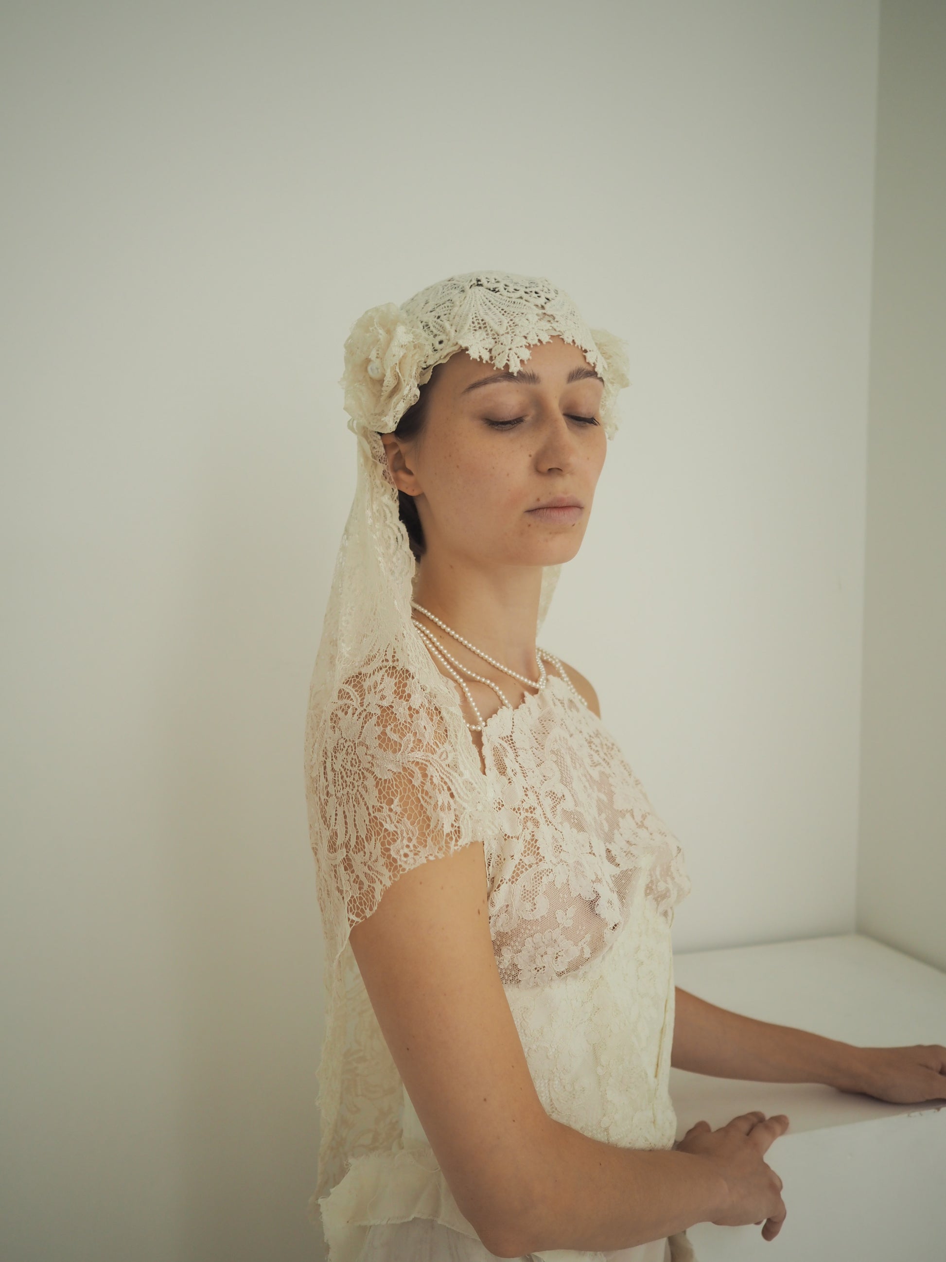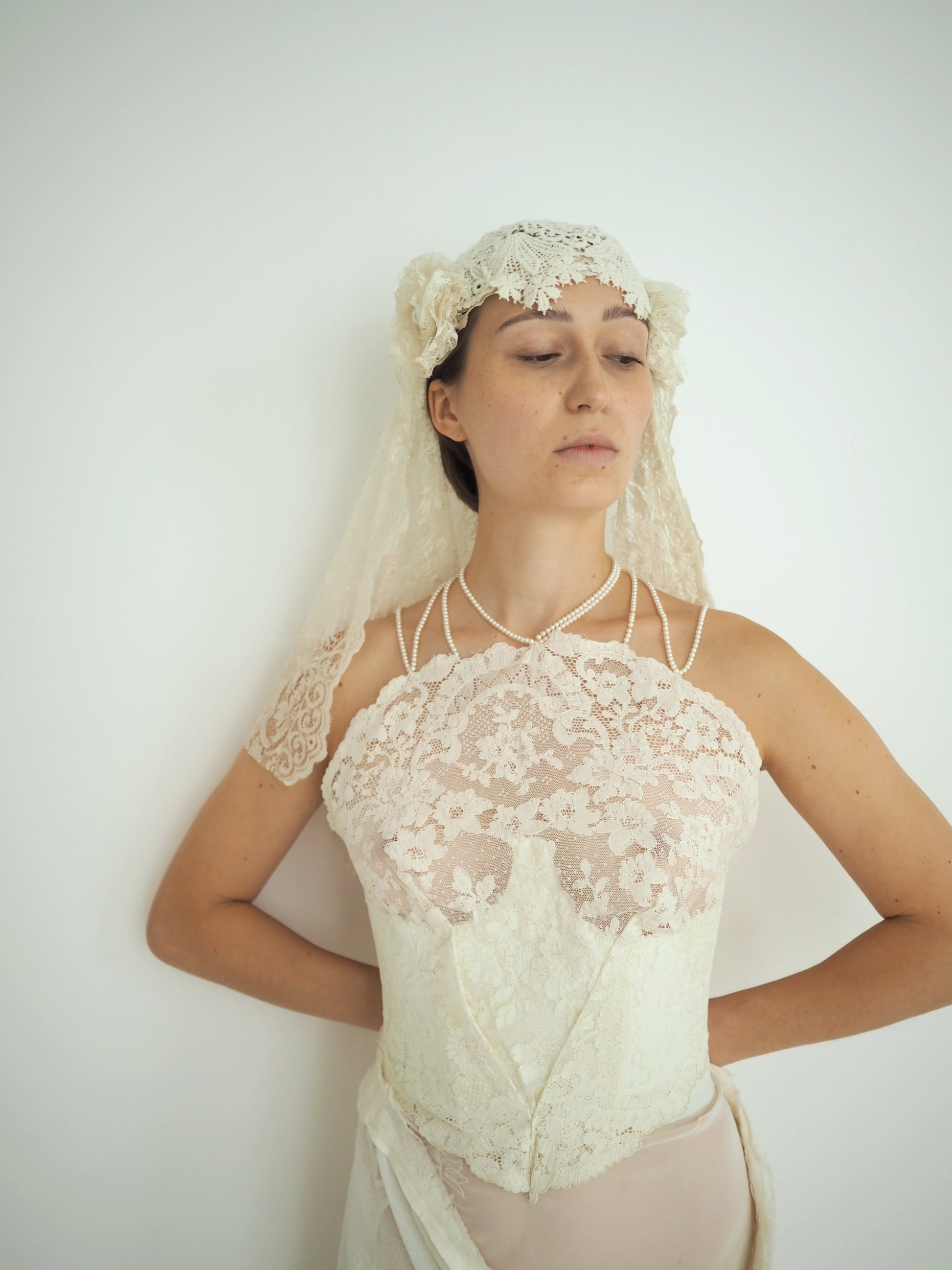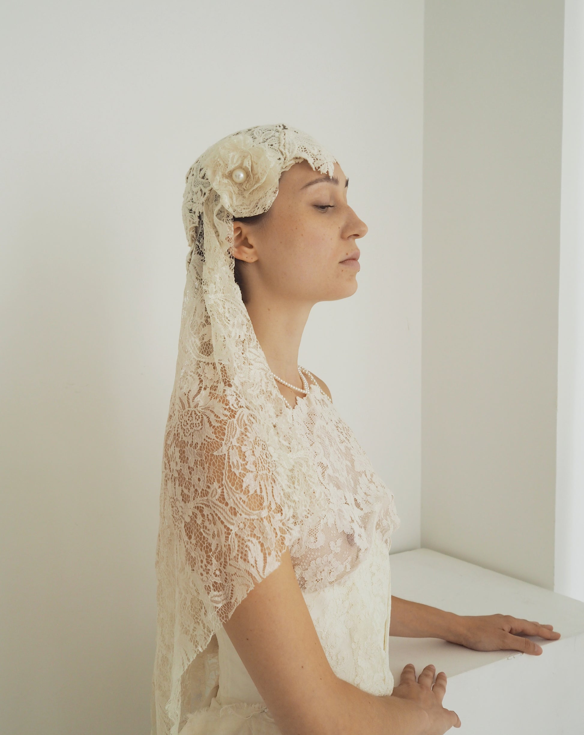 A delicate composition of vintage lace, handmade crochet, and soft floral accents on each side, this one-of-a-kind headpiece captures quiet romance and artisanal beauty. Designed to frame the face with subtle volume and texture, it evokes timeless femininity with a modern sensibility. Handcrafted in our Paris atelier, each element is thoughtfully sourced and assembled — a wearable piece of textile history, reimagined.