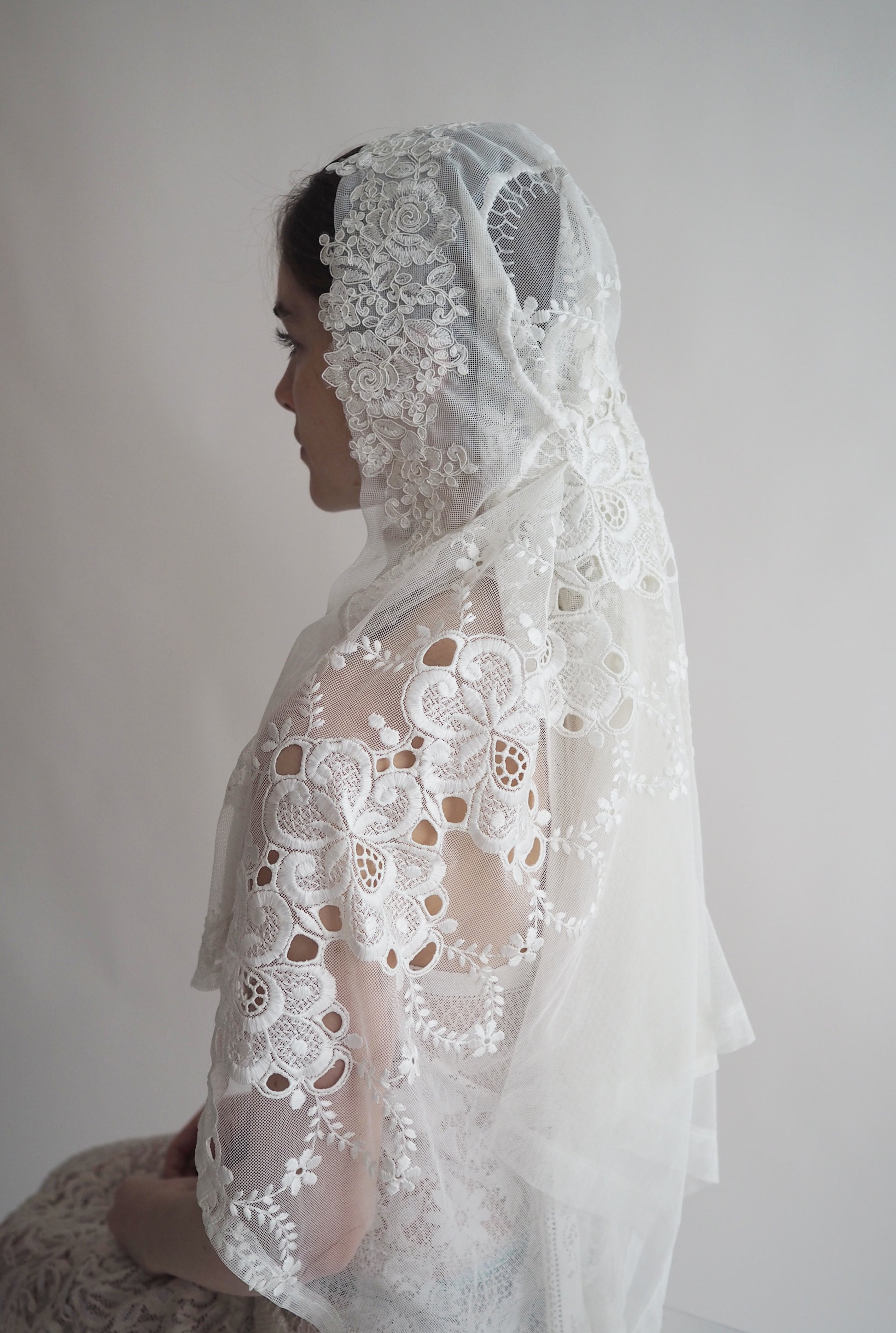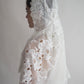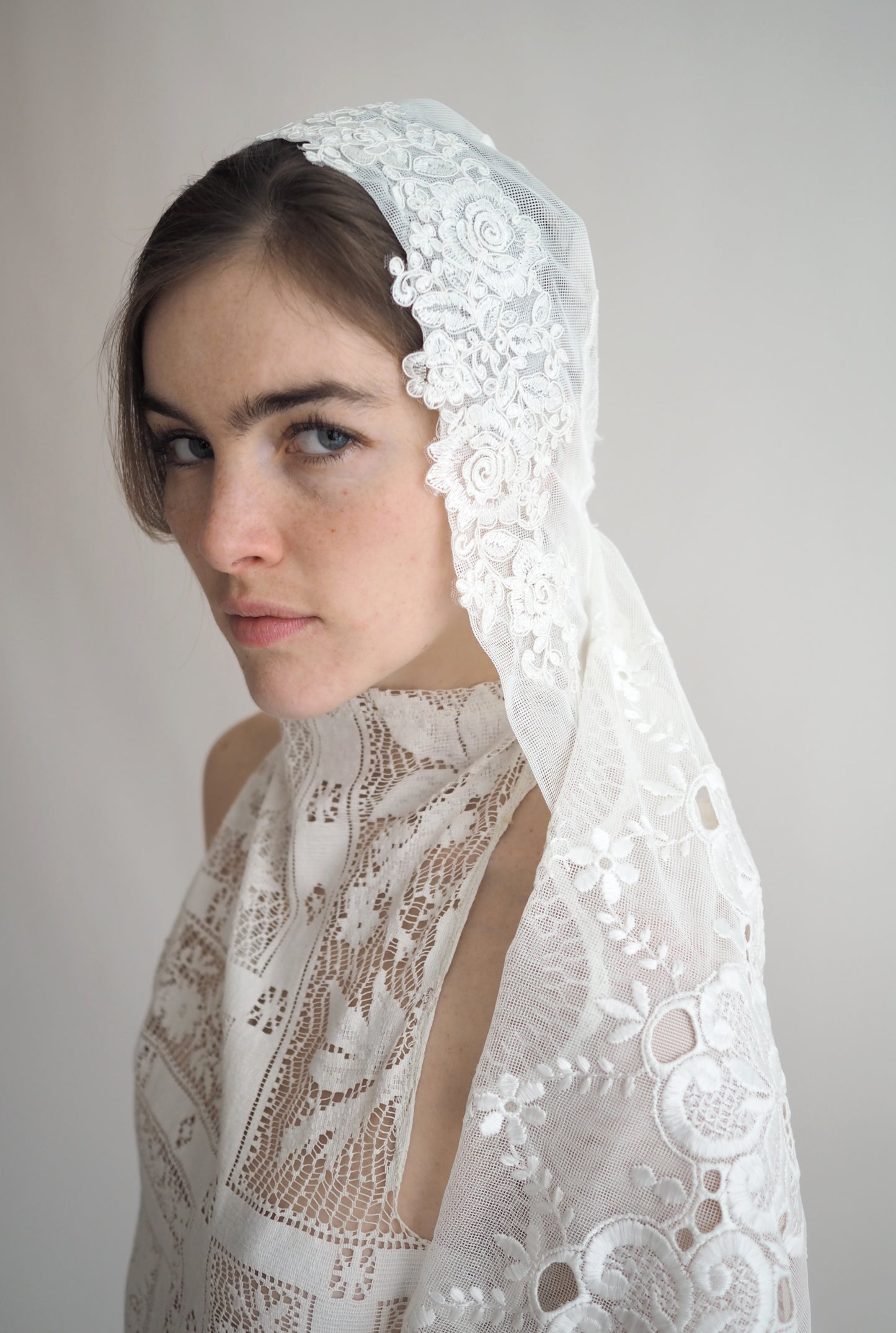 One-of-a-kind embroidered veil, handcrafted from restored 20th-century lace. This exquisite piece features delicate floral embroidery, meticulously stitched to create a romantic, ethereal aesthetic. The addition of intricate lace details enhances its vintage charm.
