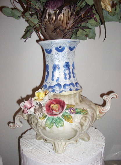 This piece is a mix of aesthetics and periods, the up vase is a recycled Chinese inspired by ming dynasty and mixing it on a romantic vase with flowers.
