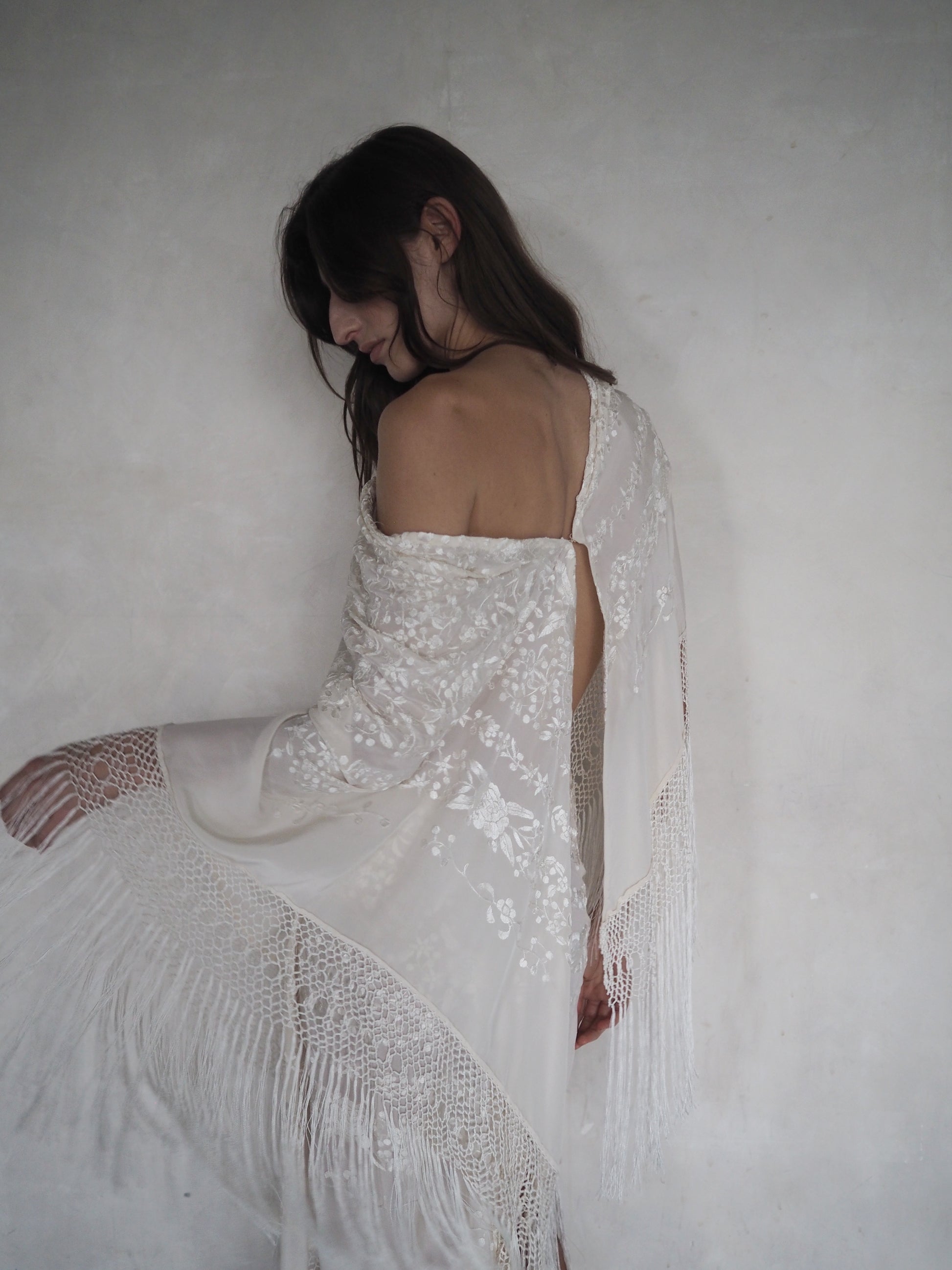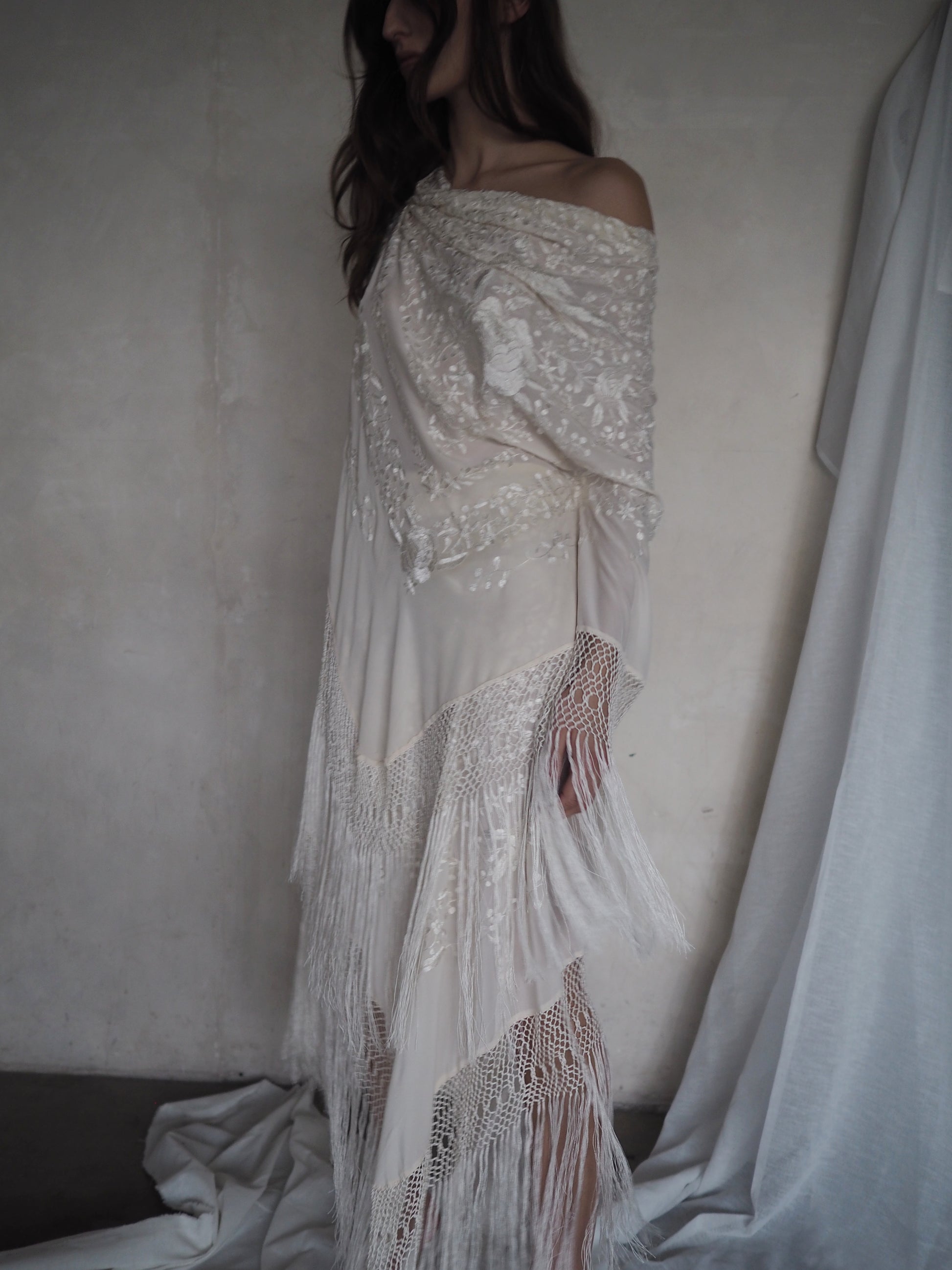A long silk skirt created from a vintage Manton de Manila, combining traditional Spanish hand embroidery with delicate fringe and crochet details. Each piece is cut and draped by hand in our Paris atelier, following the natural flow of the embroidered motifs.
