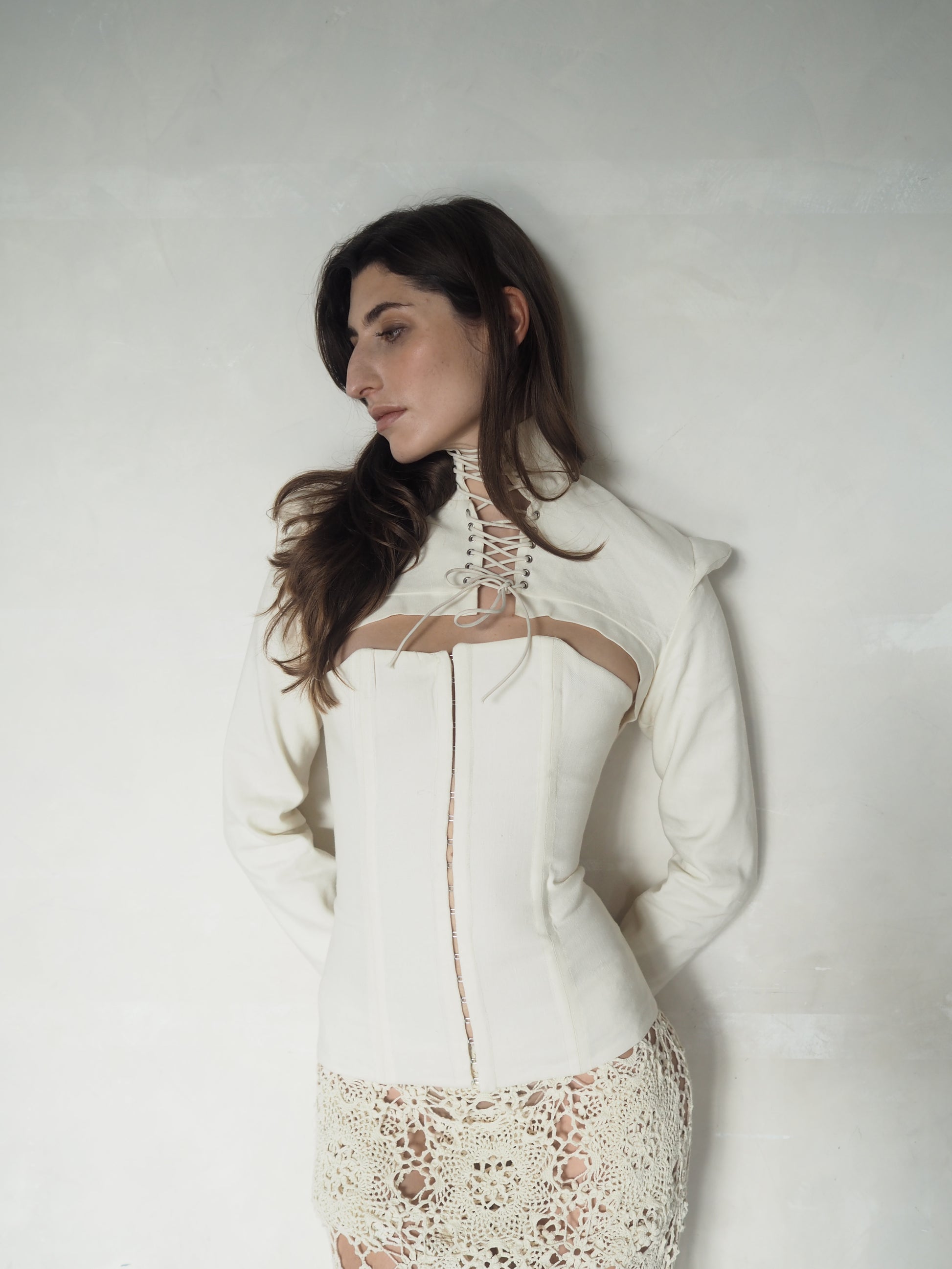 A structured corset top with integrated bolero, crafted entirely from deadstock woven fabric and finished with precise lace-up detailing at the neck and back. The silhouette is sharply contoured, combining historical corsetry lines with modern tailoring.