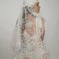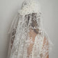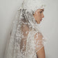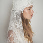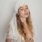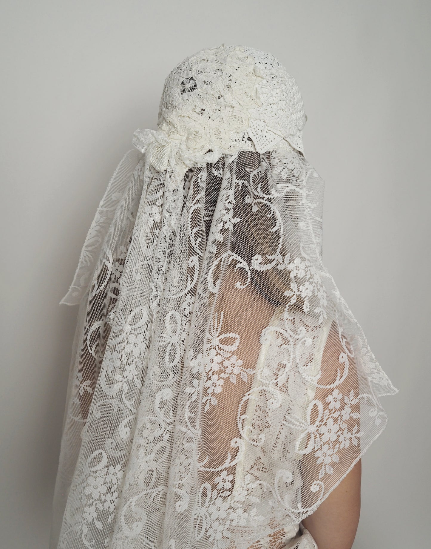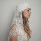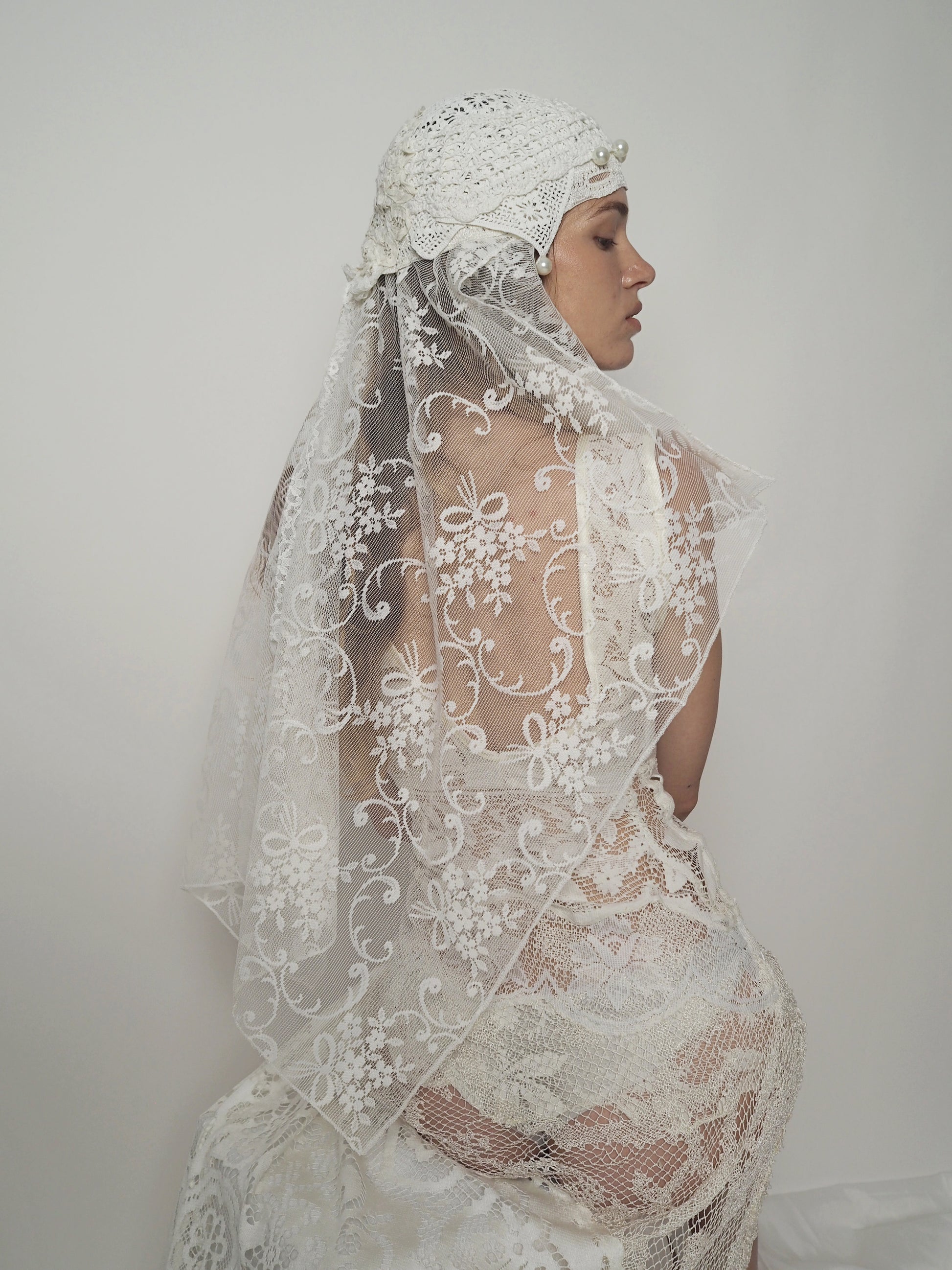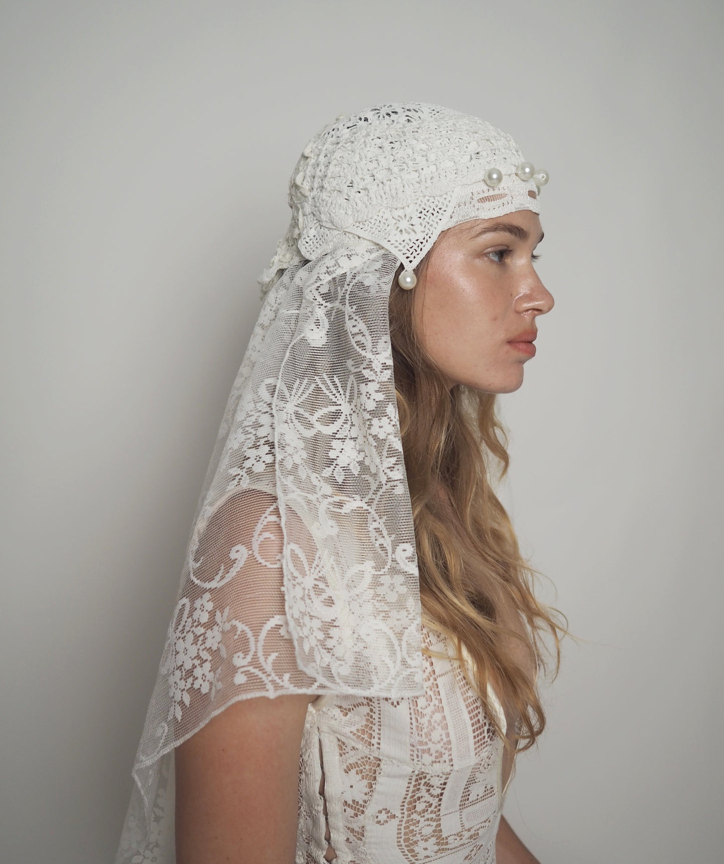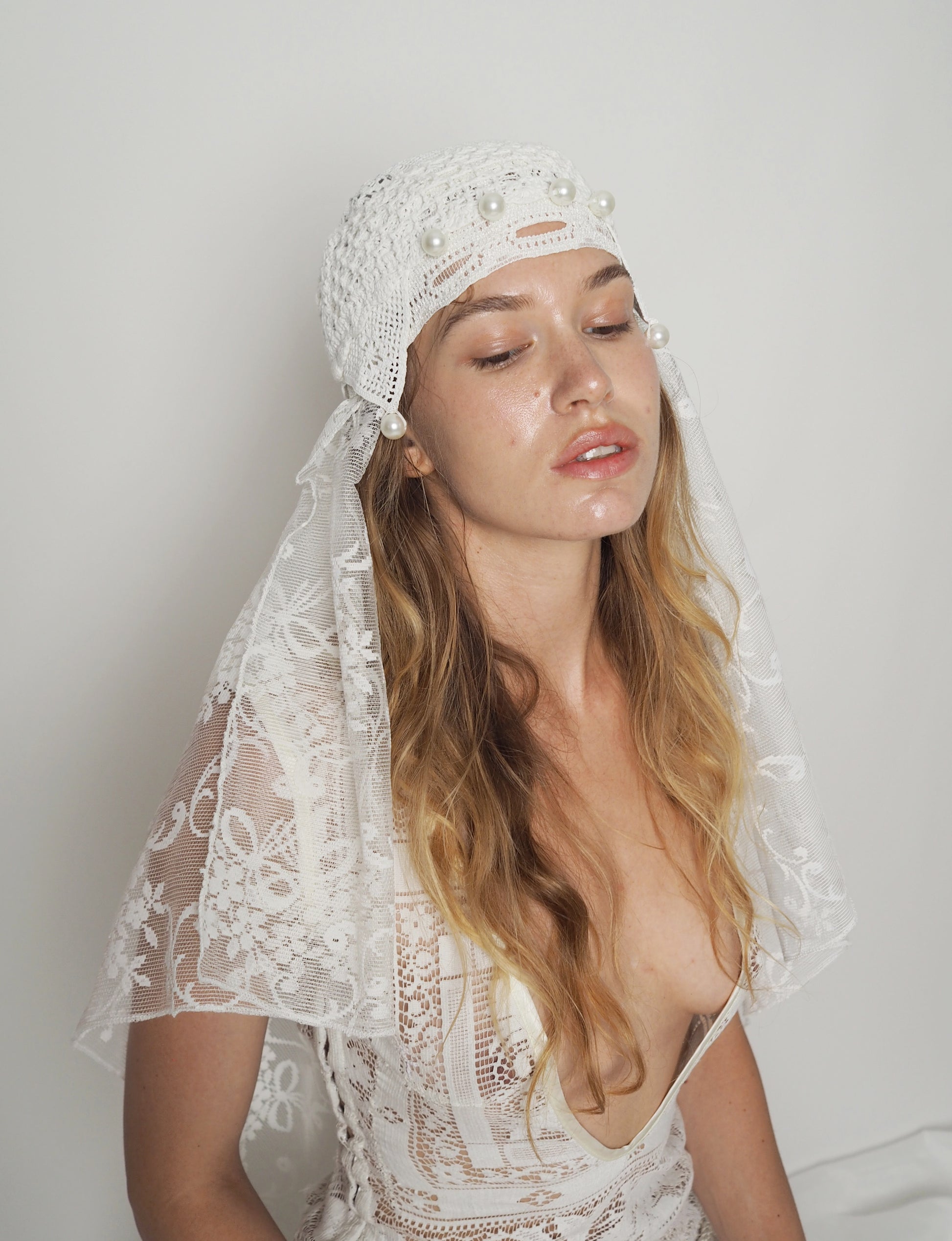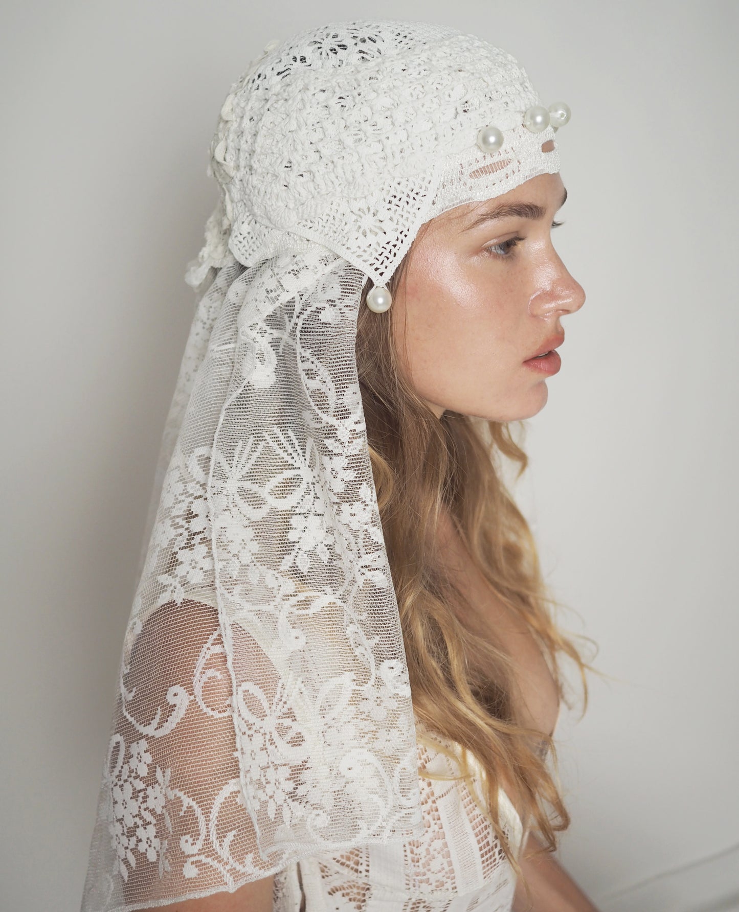 This headpiece was made with 4 different crochet and lace, made at our atelier in Paris. Embroidered pearls are around the piece.