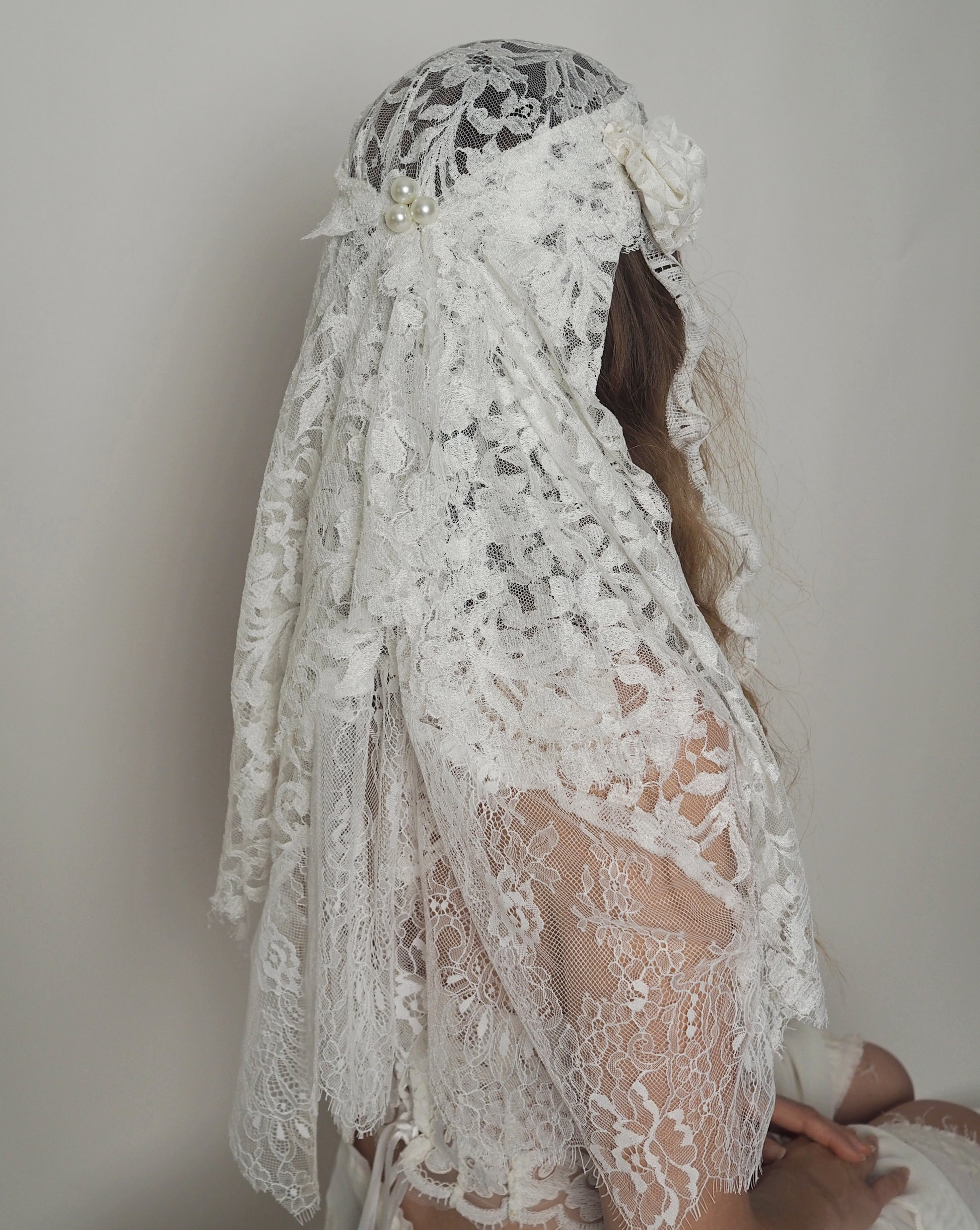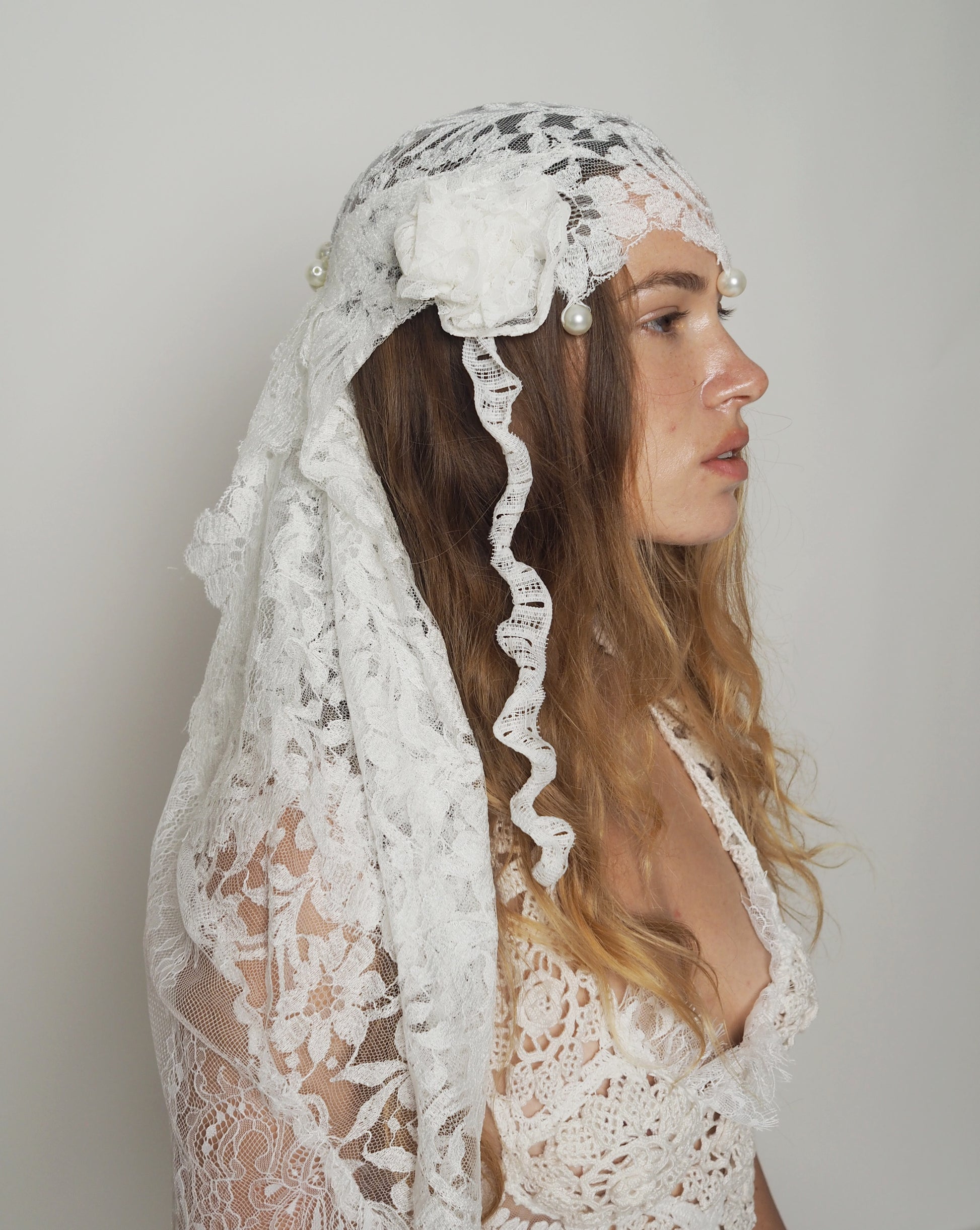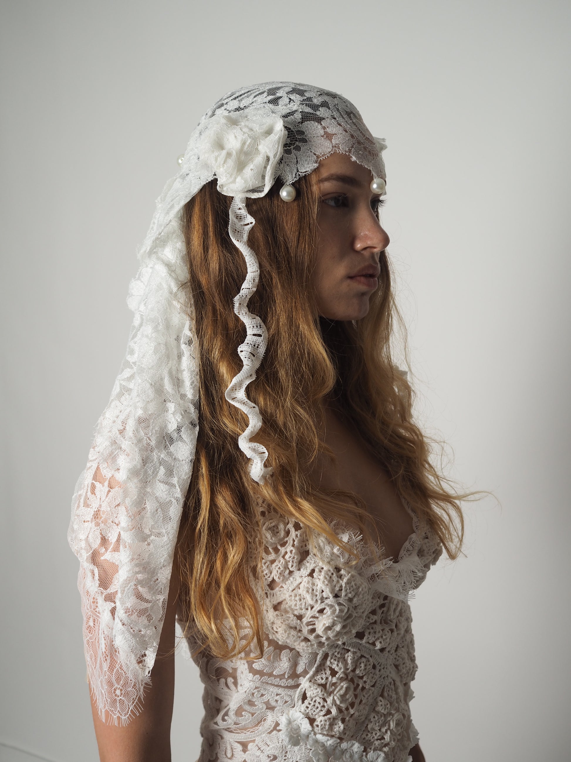 White headpiece made with antique lace using upcycling techniques. Embroidered pearls are in the front of the piece and rose lace details.